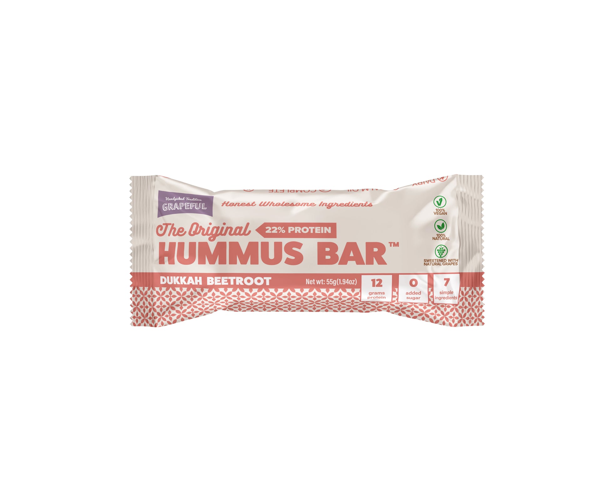 Grapeful Vegan Hummus Bar – Dukkah Beetroot 55g is a savory plant-based snack inspired by Middle Eastern flavors. Made with nutrient-rich chickpeas, earthy beetroot, and a hint of dukkah spice, this bar is high in plant protein and fiber, making it a wholesome choice for any time of the day. Naturally vegan, dairy-free, and free from artificial additives, it’s a deliciously bold snack for those who enjoy savory nutrition on the go.